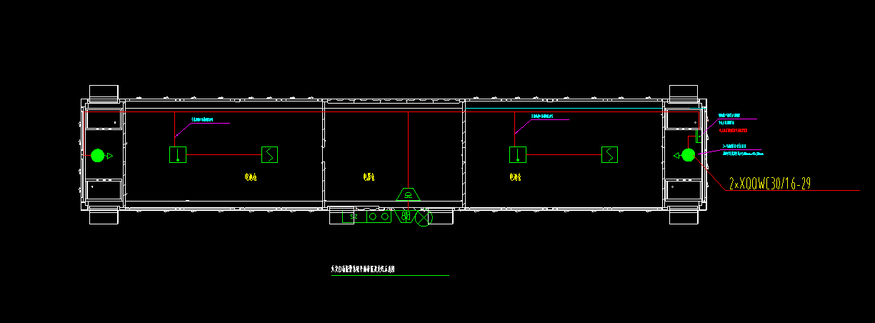 此次集装箱有一套 45 尺规格,通过客户提供的图纸,利来国国际消防工程师连夜着急工程师进行开会讨论,由负责的工程师连夜赶制出方案发给客户,又和客户的交流沟通中修改了N 次,最终确认了方案达成合作。根据《气体灭火系统设计规范》GB50370、《气体灭火系统施工及验收规范》GB50263、《火灾自动报警系统设计规范》GB50116 中的要求,这套储能集装箱消防系统由七氟丙烷灭火装置、药剂释放管路和火灾探测报警三大部分组成,根据集装箱规格,设计采用 两个30L 七氟丙烷灭火装置,充装 58KG 灭火药剂,配置 2个感温探测器和2 个感烟探测器与火灾报警主机等形成一套完整的灭火系统。同时和业主的结构工程师一起交流确定储能集装箱外部报警设备能够正常按照他们的箱体进行设计保护;内部管道固定方式;灭火装置如何固定在运输中才会更牢靠以及如何实现发生火灾报警信号传达给业主等细节。CAD 平面图如下: