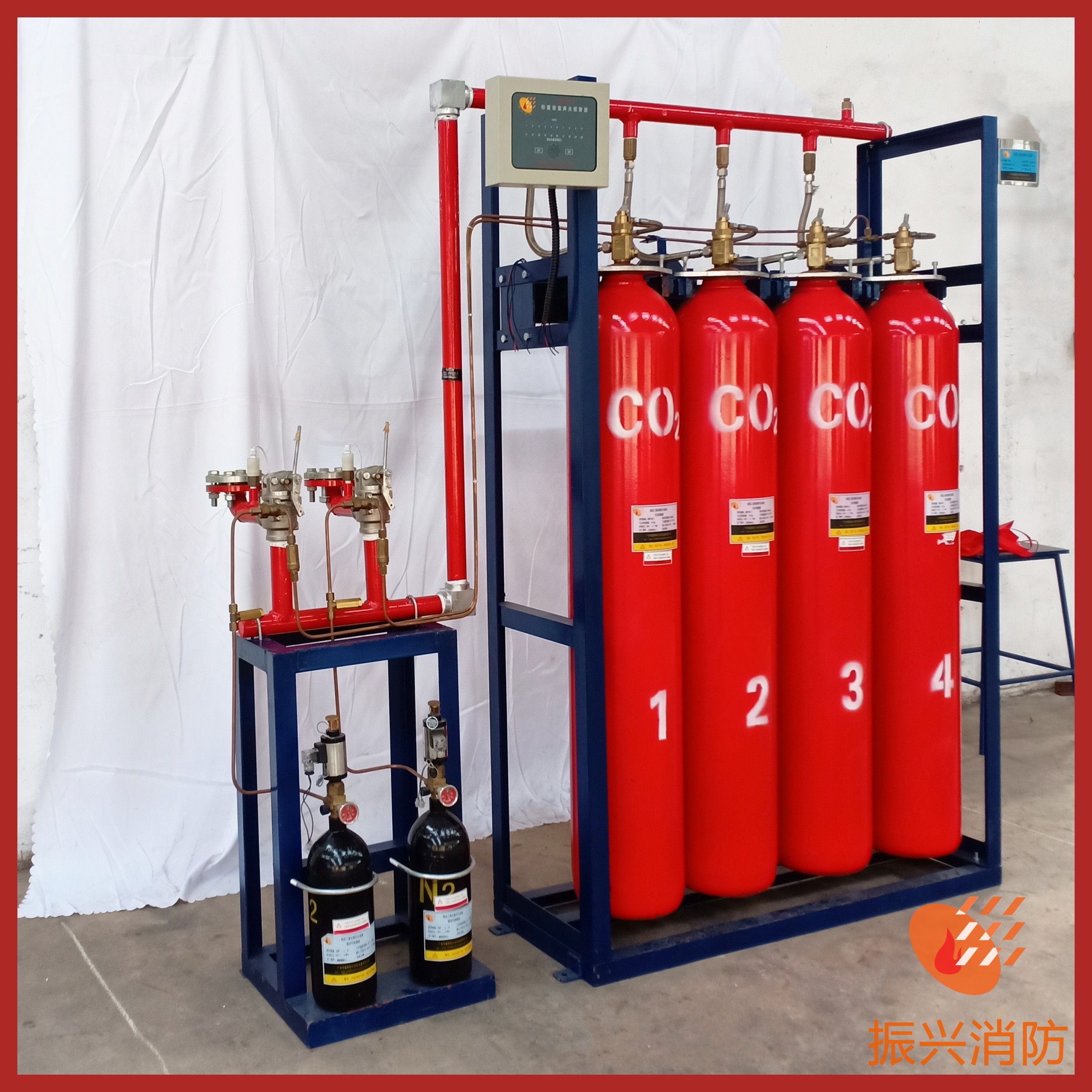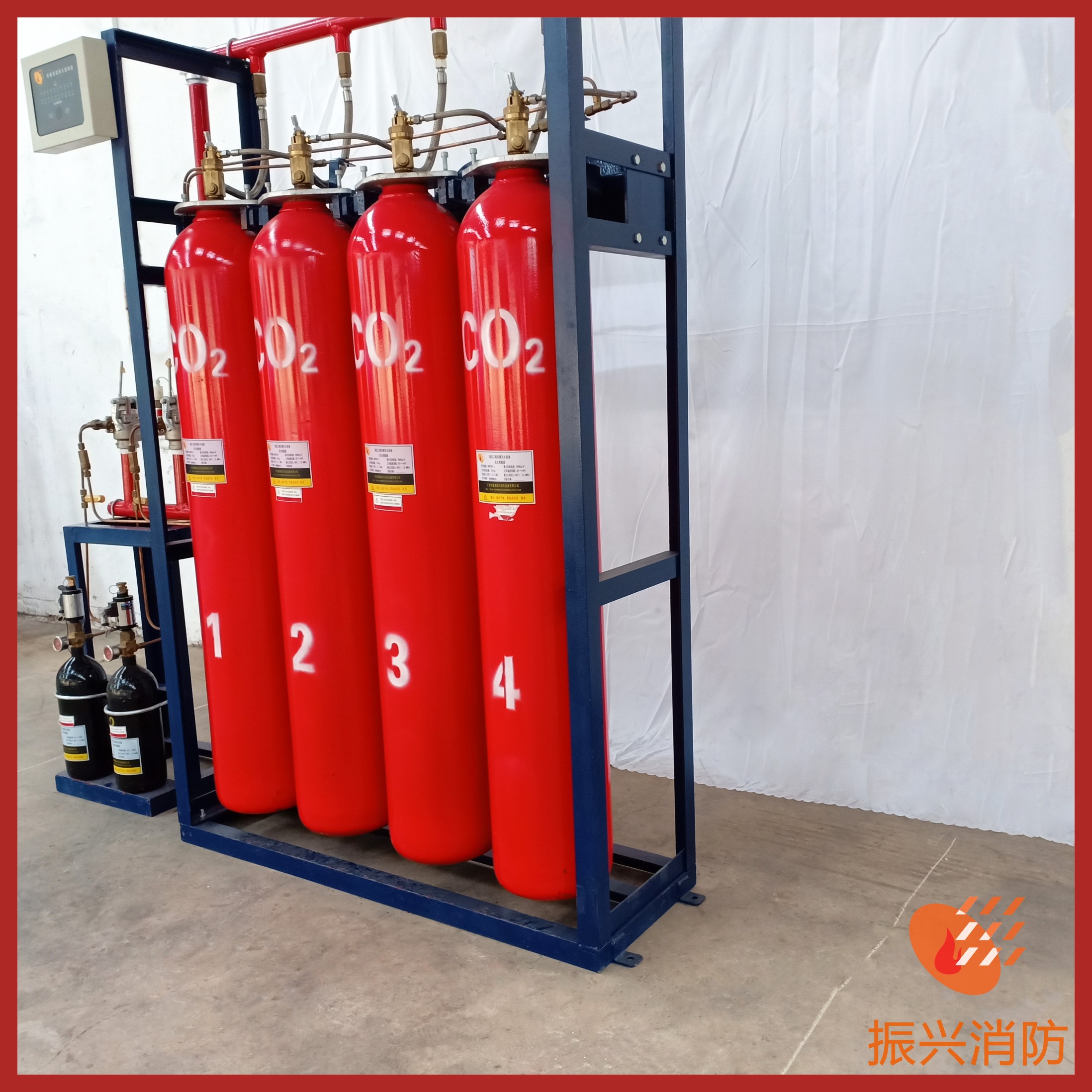二氧化碳灭火系统由瓶组架、灭火剂瓶组、检漏装置、容器阀、金属软管、单向阀(灭火剂管路)、集流管、安全泄放装置、选择阀、信号反馈装置、灭火剂输送管道、喷嘴、驱动气体瓶组、电磁型驱动装置、驱动管道、单向阀(驱动气体管路)等组成,是一种智能型自动灭火设备。根据不同应用场所使用要求,可组成单元独立系统、组合分配系统,采用全淹没灭火方式,实现对单防护区和多防护区的灭火保护,技术先进、灭火效率高、维护方便。设备具有自动、手动和机械应急操作三种启动方式。