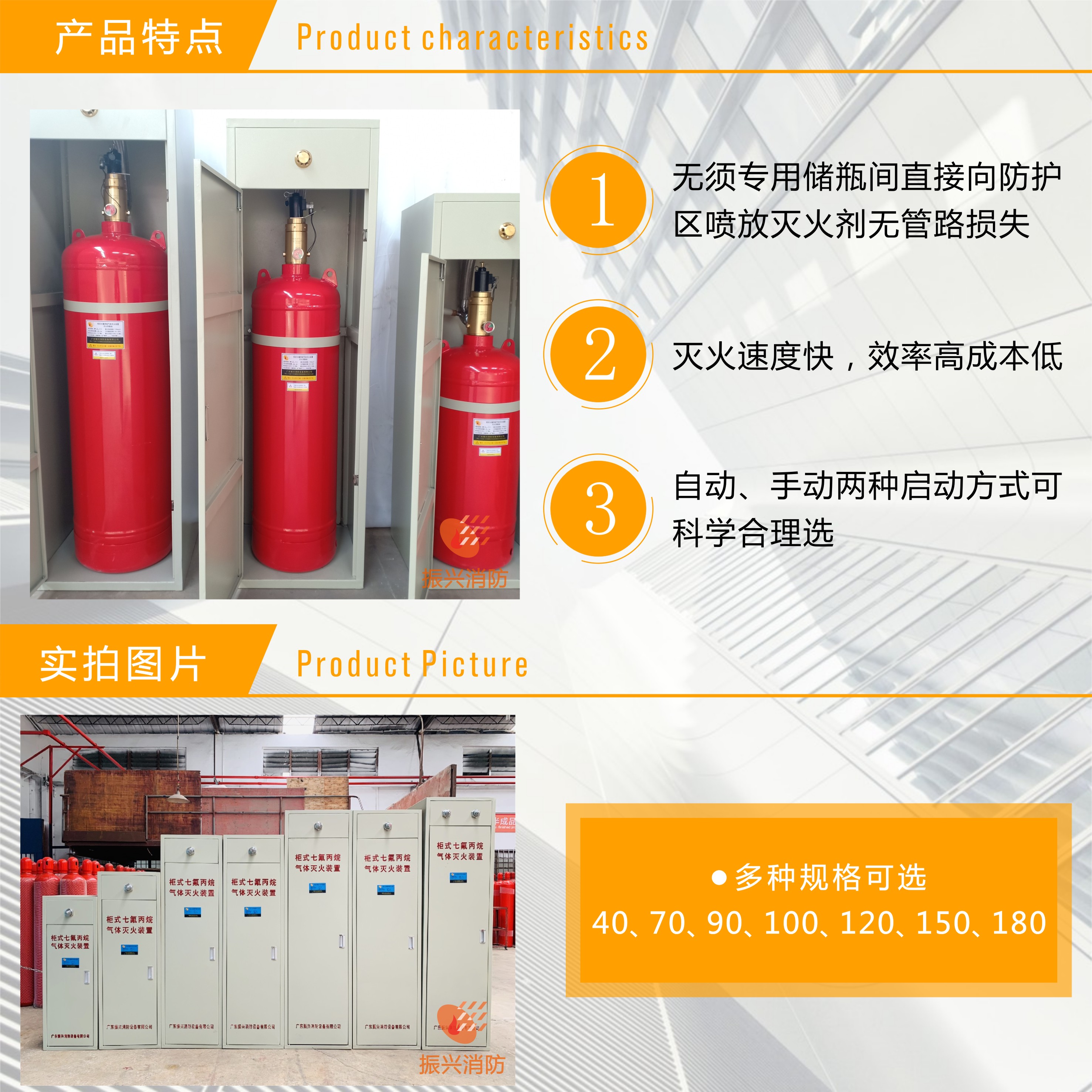 柜式灭火装置以七氟丙烷(HFC-227ea)作为灭火剂。七氟丙烷以化学灭火为主,兼有物理灭火作用,无色、无味、清洁、不导电、不污染被保护对象,不会对财物和精密设施造成损坏,对大气臭氧层无破坏作用(ODP值为零),符合环保要求,在大部分保护区域,灭火浓度均低于人体的无毒性反应浓度(NOAEL浓度),对人体是安全的,是一种优秀的洁净气体灭火剂。